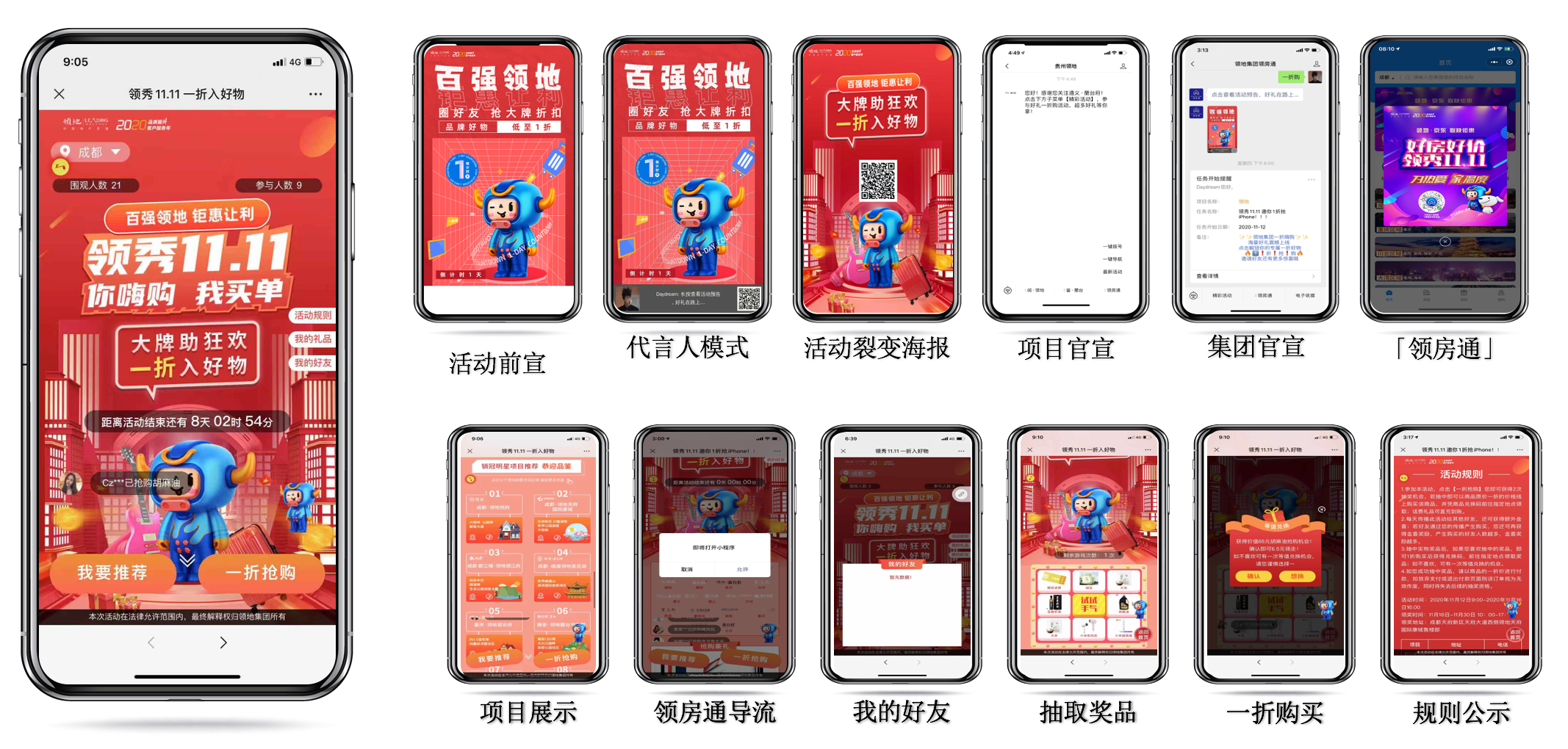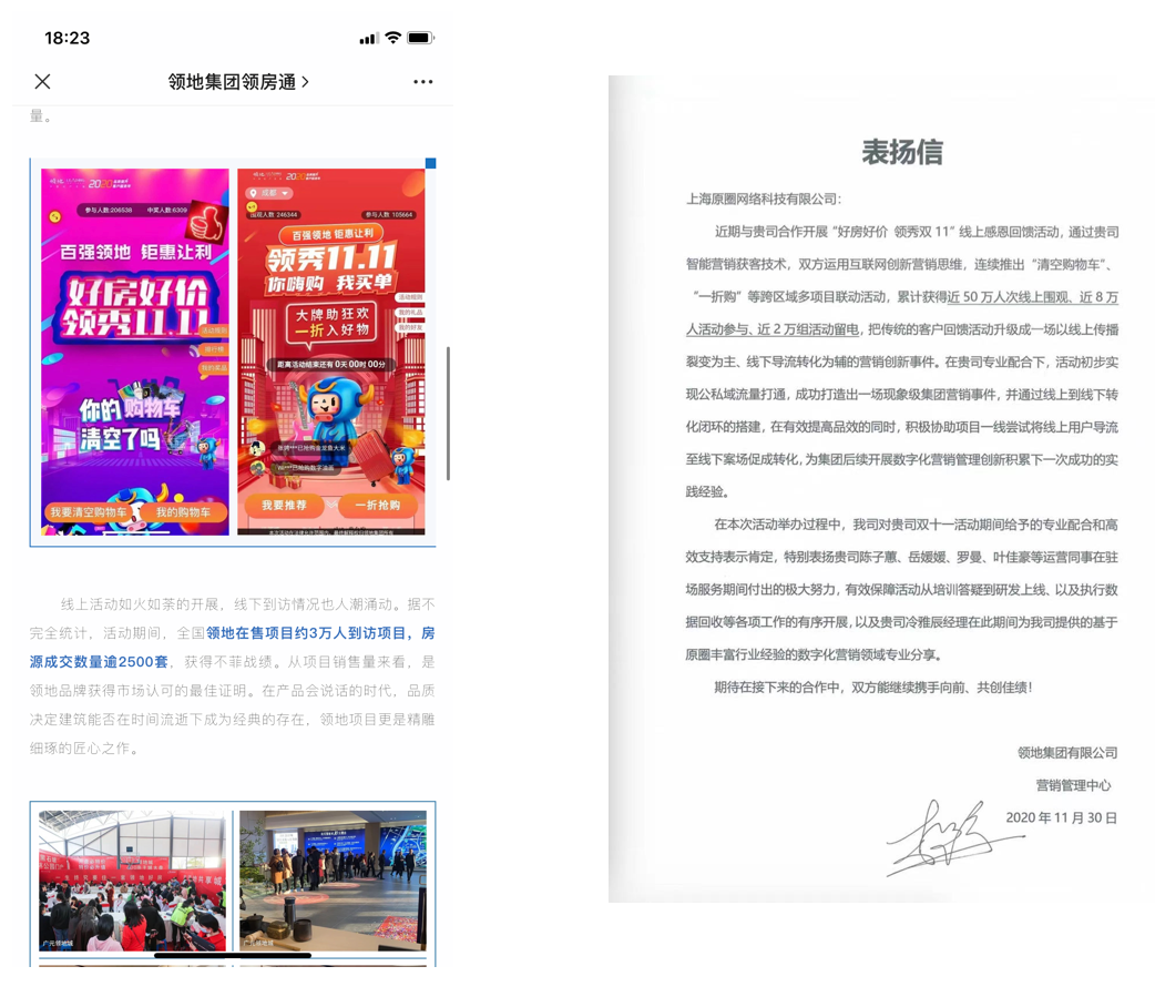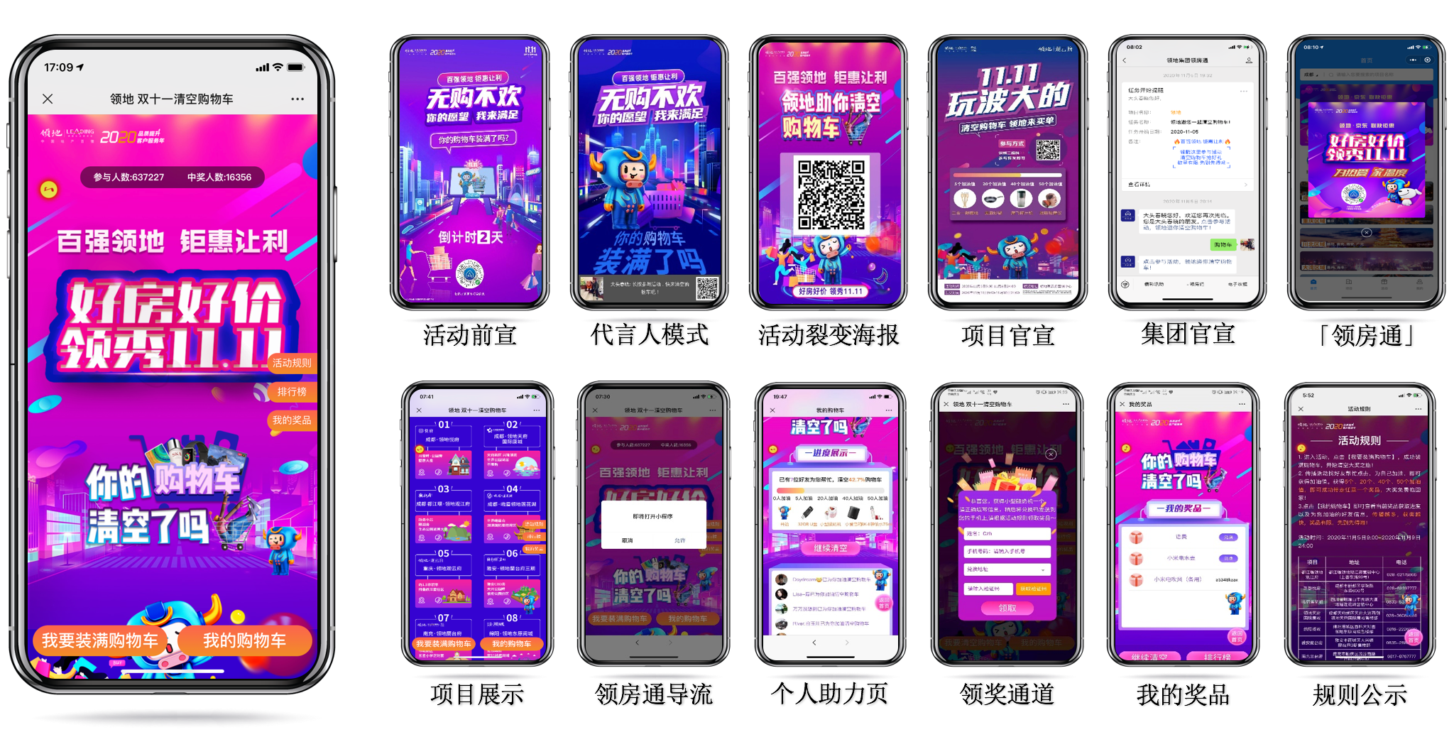 结合电商季“双11”营销热点,依托原圈科技智能营销获客及“清空购物车”“一折购”为主题的跨区域霸屏活动,打通「公域-私域」流量,实现「线上-线下」闭环结合,集中发动公司员工、老业主、媒体投放等多种渠道资源,建立种子用户群体,有效激活各区域和项目的私域客户池,打造现象级的集团营销事件,活动期间,活动链接点击人次达50万余人次,参与活动人次达15万余人次,全国领地在售项目约3万人到访项目,房源成交数量逾2500套。