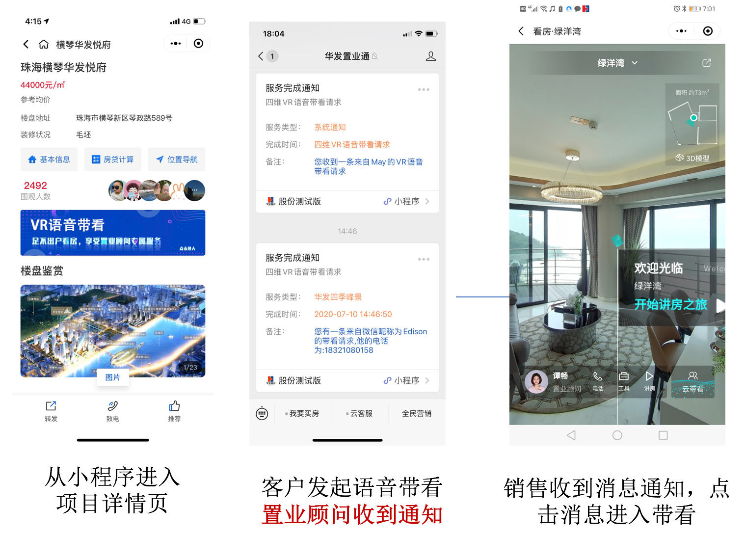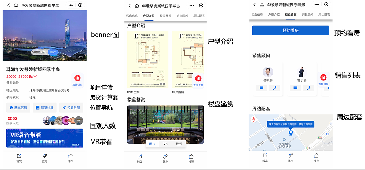 疫情期间,华发集团上线华发置业通在线售楼中心,为购房客户提供项目介绍、楼盘资讯、销售交易和售楼服务等全流程功能。帮助销售顾问提供先进的AI获客能力,提升拓客效率,驱动精准营销,同时融合全民营销系统实现一键报备,为销售、渠道、客户、管理员提供一站式营销入口,实现高效、实时、便捷的营销服务体验。