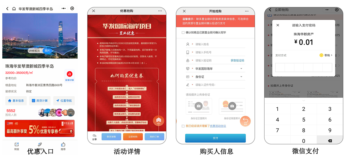 可以适用于项目各类购房优惠券的购买,通过小金额的在线支付抢购优惠券和购房成交大礼包,提前筛选高意向客户。