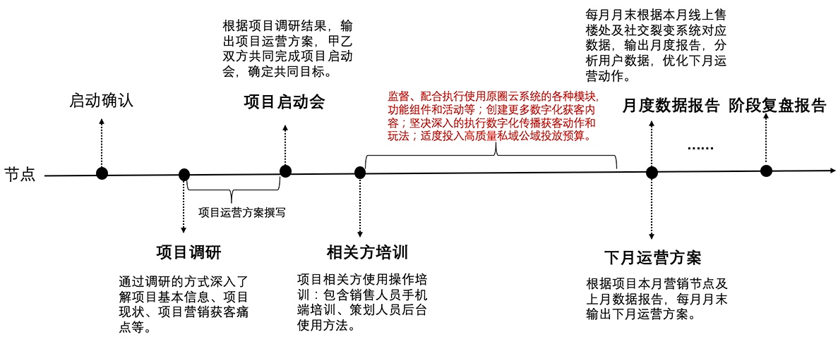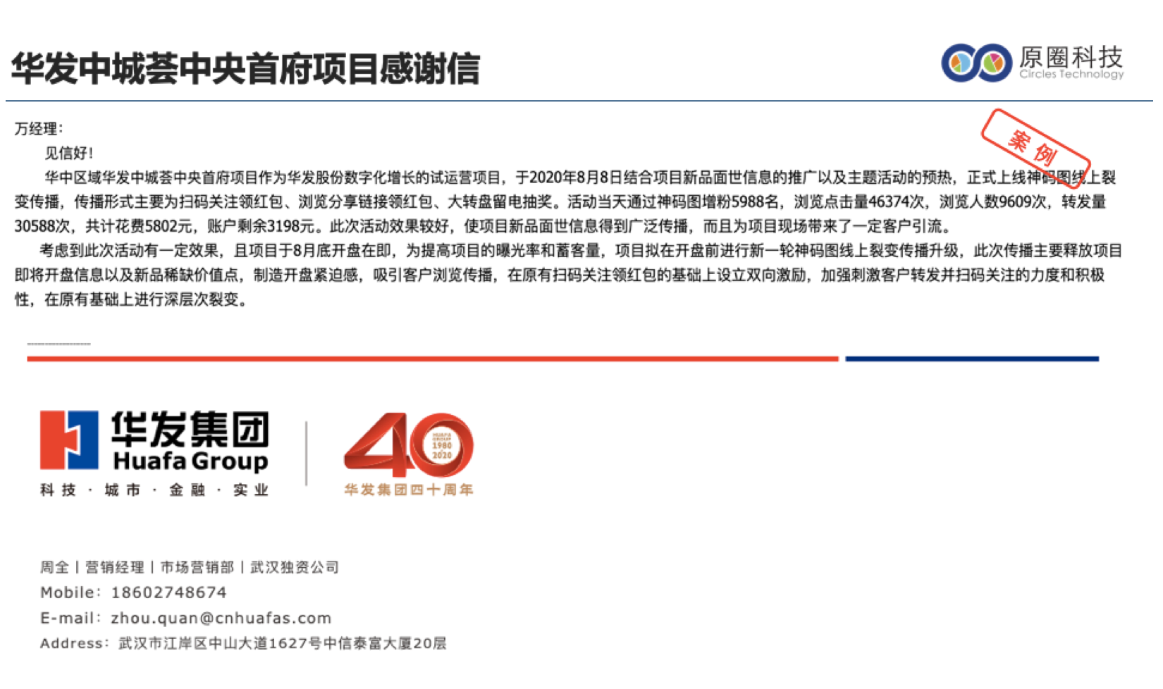 原圈的运营团队通过主动的,系统的,有计划的系列工作,适度的介入到华发的策划营销推广过程中去,驱动客户通过使用原圈云系统的各种模块,功能组件和活动等,创建更多数字化获客内容,更坚决深入的执行数字化传播获客动作和玩法,适度投入高质量私域公域投放预算,使得客户用较低的学习门槛和资金投入,能够看到可量化的、稳定的触达、互动、咨询、留电和到访效果,同时带来成交提升 。