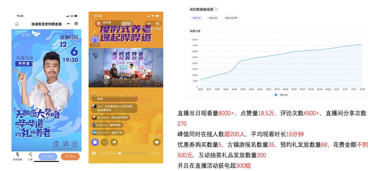 通过微信小程序的私域直播,结合项目特性及客群特征,联实邀请了上海本地,深受叔叔阿姨们喜爱的反串视频博主,搭配专业销售经理担任直播主持人,以城市养老话题为主线,结合项目介绍,加抽奖送福利环节,以及多种多样实物奖品、免费朱家角古镇一日游、优惠券秒杀等福利,促进案场到访及最终成交转化。